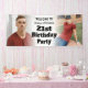 Modern 21st birthday party welcome sign for men. Personalized banner with a modern 2-photo collage and bold letters. For inside or outside use. To change the photo placement: click on the button to customize the design, click on "crop", and move the image to centre it.