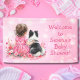 Girl's baby shower personalized Welcome to our baby shower banner. Sweet baby girl sitting next to her little black and white Mini Aussie puppy dog in a patch of pretty watercolor wildflowers.