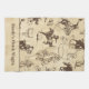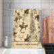 This personalized Western themed kitchen towel pattern with a variety of rodeo cowboys in action riding, roping, and bronc busting, interspersed with saddles, boots, and hats, on a vintage background.