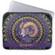 Protect your device with style using this Personalized Whimsical Aries Zodiac Dot Mandala laptop sleeve. This beautifully designed sleeve showcases an intricate mandala centred around a striking stylized ram’s head, capturing the bold and adventurous energy of Aries. The ram is adorned with detailed spiralling horns and swirling patterns, set against a rich colour palette of purples, blues, and golden hues that bring depth and vibrancy to the design. Encircling the ram is a concentric arrangement of decorative arcs, filled with petal-like and teardrop shapes reminiscent of traditional mandala art, lending an air of elegance and symmetry. Crafted for both protection and aesthetic appeal, this customizable laptop sleeve is perfect for anyone who wants to make a statement while safeguarding their tech. Personalize it with your name for a one-of-a-kind accessory that blends functionality with artistic beauty.