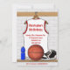 Customizable white and red sports basketball jersey hanging in a locker room with a basketball, basketball sneakers and a water bottle. The jersey is customizable with your own number and name to create a truly unique gift for the basketball player, basketball fan or basketball coach.