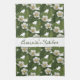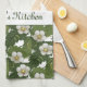 Personalize this floral-designed kitchen towel with a name or other text. This pretty hand or kitchen towel features a white strawberry flower with a green leaf design. Buy a set of towels as a housewarming or another occasion gift for that special someone. This white flower will coordinate well with other strawberry kitchen accents.