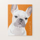 Personalized pop art french bulldog puzzle featuring a cute white frenchie on a deep orange background that can be changed to any color, and your name.