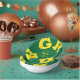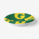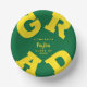 GRAD in bold yellow lettering curves around the edges of these green background graduation paper bowls personalized for your graduate - perfect for serving snacks, salads, desserts and more. MATCHING items and more pre-done colour combinations in our store.