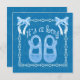 Personnalisez l'invitation baby shower bleu avec cadre bleu et deux mignons petits arcs en haut de chaque coin. Et deux chaussures bébé et un texte C'est un garçon ! au centre. Dans l'arrière - plan il est répétable motif de Baby shower de texte.