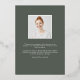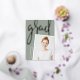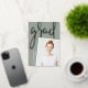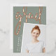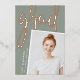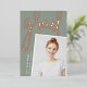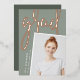 Un faire-part moderne de graduation de photo comporte une photo verticale ou à orientation portrait avec un léger inclinaison pour un regard neuf. "Grad" apparaît dans la brosse lettrée rose feuille d'or typographie script. Personnalisez avec le nom du diplômé, l'école et l'année de fin d'études. Ajoutez un message personnel à l'arrière, ainsi qu'une photo supplémentaire.