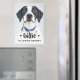 Pet memorial fridge magnet featuring your custom pet photo with with the pet's name as a black (or custom colour) text overlay flanked by two hearts and customizable text “In loving memory” below.