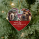 Heart Shaped Personalized Printed Photo Christmas Ornament with a custom design with a photo of your dogs or puppies with "Merry ChristMUTTS" and their names and year on a festive rustic red typography design.