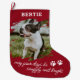 Personalized pet christmas stocking featuring a deep red background that can be changed to any colour, a photo of your dog or cat, the pets name, and the cute saying 'may your days be snuggly and bright'. On the reverse is a traditional festive plaid tartan pattern.