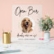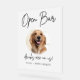 Cute editable pet wedding signature drink sign features a circle frame to feature your pet's picture along with calligraphy font Open Bar, drinks are on us! Personalize with the bride and groom's names and pet name.