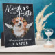 Rustic pet memorial keepsake plaque featuring a faux slate chalky background, the title 'forever in our hearts', paw prints, a photo of your beloved pet dog or cat, angel wings, their name, and the sympathy saying 'I'll see you on the other side'.