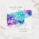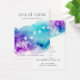 Earring jewellery product display card with your brand in a modern script font and a purple and aqua blue watercolor splash with a white paw print animal track. Customizable text and logo on the back.