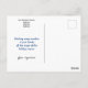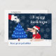 This cute postcard is for pet sitters, dog walkers, and any pet-related business. A little dog is looking up at Santa, who is putting a star on top of a blue Christmas tree with blue lights. The front text says "Happy Holidays" and below it says "from your pet sitter." All text is fully customizable.