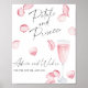 Watercolor elegant rose petals with glass of champagne and text "Petals and Prosecco".