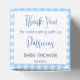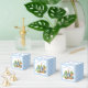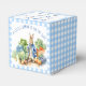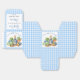Peter rabbit with a blue jacket and garden vegetables baby shower favours personalized favour box template. A cute bunny in a blue jacket standing in veggie garden for a baby boy baby shower pastel blue gingham favour boxes suitable for candy almonds nut favours, can fit about 20 coated almonds