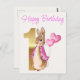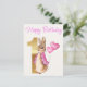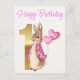 Peter the rabbit with pink heart shaped balloons and Happy First birthday greeting