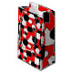 Ce sac cadeau a une conception Bauhaus de triangles, cercles, rectangles et pentagons en noir et blanc sur un champ de rouge.