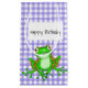 Mignonne grenouille verte sur motif en vichy violet blanc avec bulle vocale pour n'importe quel âge. Le texte peut être modifié.