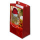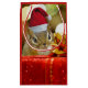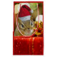 Ce mignon chipmunk portant un chapeau de Père Noël regarde derrière un cadeau de Noël rouge vif et l'arc en or pour vous souhaiter des "fêtes de chipper" pour la saison.