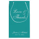 Un simple sac de faveur à désherber avec une couleur très moderne : bleu turquoise. Il n'a que du texte blanc sur l'arrière - plan bleu turquoise. Le message "Amour & Merci" et les noms de la mariée et du marié sont écrits en calligraphie élégante.