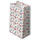 Sac cadeau de Noël mignon avec un motif de Noël vert, des mitaines chaudes en laine, des bas mignons et des billes rouges sur un arrière - plan blanc.