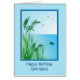 Une belle scène de pêche en mer. Une magnifique carte d'anniversaire pour un petit-fils qui aime la pêche, ou qui aime juste la mer. De grandes herbes encadrent une vue sur un océan calme avec un petit bateau et un homme qui pêche. Le verset intérieur a la chance du pêcheur de vouloir des "lignes serrées".
