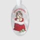Un adorable petit chien du Yorkshire Terrier sort d'un sac cadeau rouge sur le devant de cet ornement de Noël. Quelques ampoules turquoises et or motif Holiday sont juste devant le sac Père Noël.Le texte au-dessus de l'image dit "MERRY CHRISTMAS" en rouge. L'image et le texte sont placés sur un arrière - plan de livre abstrait argenté. Le fond de l'ornement a la même image, mais avec le texte "HAPPY NEW YEAR" en vert turquoise.