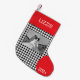 Trendy pet Christmas stocking featuring your pet photo, black and white buffalo check background, red top and toe and white name across the top. The back is a solid red. Dimension: 9" x 16". Easily change the name, edit or remove the year on the toe, and add your own photo using the Template provided. Excellent print and quality materials. See "About This Product" for more information. Made in the USA.