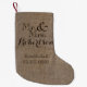 Vintage style chic avec l'apparence d'un sac de pommes de terre customisé avec votre propre nom de famille et date mariage. Motif imprimé à l'aspect tissé avec impression personnalisée brun foncé dans un tourbillon et une police à visage ouvert. Copyright de conception © CuteComfy.com