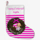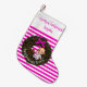 Insufflez votre décor de vacances avec joie en utilisant ce bas de Noël rayé rose et blanc, personnalisé avec l'accueil festif "Joyeux Noël! Angela." Le design charmant comprend une adorable petite fille assise dans une couronne de Noël, accompagnée d'un ours en peluche et d'une sucette. Personnalisez tout le texte pour commémorer le "1er Noël 20XX !" de votre petite fille - un souvenir qui capture la magie de la saison (changez les Xs à l'année que vous voulez).