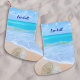 Plage de Noël avec nom et design de chaque côté. Accrochez ce joli bas face à gauche ou à droite. Eau tropicale bleue de l'océan, sable de plage et une image réaliste de dollar de sable décorent les deux côtés. Le nom est dans un script bleu-violet et sera imprimé sur les deux côtés.