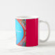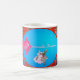 A beautiful coffee or tea mug with a dancing couple in formal dress and kilt against a periwinkle blue and cherry red plaid with Scottish bluebells.