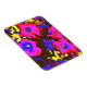 A vibrant blue, purple, red, yellow and black pop art design of petunias.