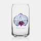 Le thème floral peut verre qui présente l'image photographique d'une grande fleur blanche d'orchidée Phalaenopsis aux accents violets. Le genre de fleurs est imprimé en violet. L'image est imprimée sur un côté seulement du verre. Parfait pour servir de la bière, des sodas, de la limonade, du thé glacé et plus encore à des fêtes, des mariages, des pique-niques, etc. Disponible en solo ou en set.