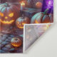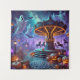 Under a star-speckled sky veiled in mist, a haunted carousel spins in eerie silence. Ghosts drift lazily through the air, their translucent forms glowing against the backdrop of leafless trees and flickering lanterns. Bats swoop overhead, weaving through the shadows as jack-o'-lanterns grin from every corner, casting warm orange light across the cobblestone ground. A circular pattern etched before the carousel hints at forgotten rituals and spectral gatherings. The atmosphere is festive yet foreboding—a surreal blend of childhood wonder and supernatural mystery.