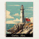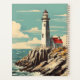 Un phare et un chalet de gardien sont assis sur un promontoire rocheux, surplombant une mer calme par jour bleu ciel, rendu dans un style d'affiche de voyage vintage.