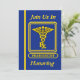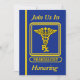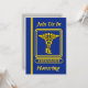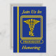 This blue and gold invitation is decorated on the front with a Pharmacist gold caduceus. You can customize this card by placing your information into the boxes provided.