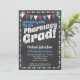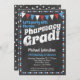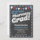 A fun and unique pharmacy graduation party invitation in chalkboard style with red, white and blue flags and a whimsical polka-dot border with dots on the back.