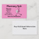 Pharmacy Technician Pharmacist Business Cards pink, Artist designed stick person "runs with prescriptions". Customizable contact information on front and back of card. Background colour may also be changed by purchaser.
