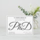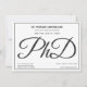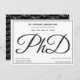 A PhD graduation party invitation in black, grey, and white. This invitation also has a pattern of the word PhD, in script, on the back.