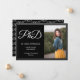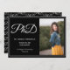 A vertical photo announcement for a PhD graduate. This design has white letters with the word PhD in a script font and a black background (the paper is currently set to a shimmer paper type to give the announcement more emphasis). The photo is a template that is meant to be swapped out for your own. All the words can be customized.