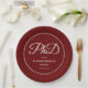 Paper plates for a PhD graduation party with a burgundy background and white lettering.