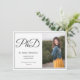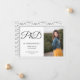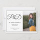 A vertical photo announcement for a PhD graduate. This design has grey letters with the word PhD in a script font and a white background (the paper is currently set to a shimmer paper type to give that background more emphasis). The photo is a template that is meant to be swapped out for your own. All the words can be customized.