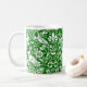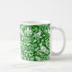 Mug in a William Morris, Art Nouveau wallpaper design of pheasants and hares set among leaves, vines and flowers - white on a deep emerald green background