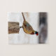 This is a Pheasant in Wyoming, USA standing on a fence post in the winter. There is snow in the background.