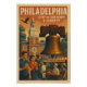 Retro travel poster of Philadelphia, USA, showcasing its history and culture. The Liberty Bell in the foreground, cracked but iconic, glowing under warm sunlight. Behind it, Independence Hall with its clock tower, surrounded by leafy trees