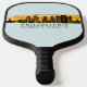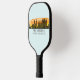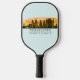 Stylish pickleball paddle features Philadelphia Pennsylvania city skyline silhouette with sunset watercolor splash background and latitude & longitude map coordinates on pale blue background. Great gift idea for pickleball lovers.