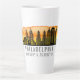 Stylish latte mug features Philadelphia Pennsylvania city skyline silhouette with sunset watercolor splash background and latitude & longitude map coordinates.