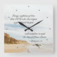 inspirational quote scripture wall clock depicts a simple nature photograph with blue skies, a sandy ocean beach and rock formation. It features Bible Verse Philippians 1:6, "Being confident of this, that GOD who has begun a good work in you will complete it until the day of Jesus Christ." Photograph by Zach Camp.