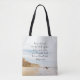 inspirational quote scripture personalized tote bag depicts a simple nature photograph with blue skies, a sandy ocean beach and rock formation. It features Bible Verse Philippians 1:6, "Being confident of this, that GOD who has begun a good work in you will complete it until the day of Jesus Christ." Photograph by Zach Camp. Customized the back with a name or details of your choice._